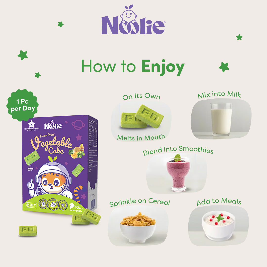 Terbuat dari 28 macam buah dan sayur, termasuk brokoli, kale, kubis brussel dan superfood quinoa dalam satu gigit, Vegetable Cake kami diformulasi dengan teknologi pengeringan beku yang canggih untuk mempertahankan nutrisi esentiil. Kue-kue renyah ini tak hanya nikmat, juga kaya serat dan prebiotik yang baik untuk usus. Kemenangan untuk para orang tua dan anak-anak!